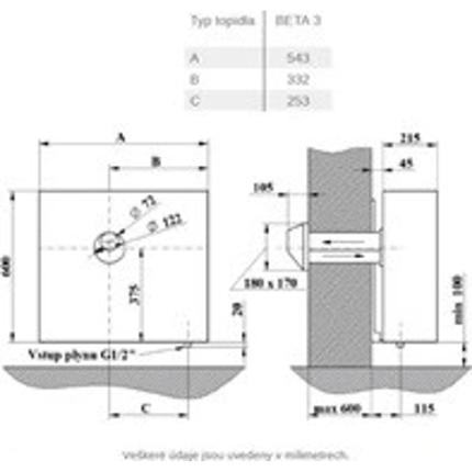 V ceně není zahrnut odtah spalit. Při nové instalaci je nutné odtah zakoupit zvlášť. Viz příslušenství. výkon topidla 3,0 kW topidlo vhodné pro místnosti o objemu až 40 m³ automatické udržování teploty místnosti bez nutnosti další obsluhy mechanická regulace teploty v rozsahu 13 až 38 °C nevyžaduje připojení k elektrické energii nezámrznost topidla vysoká účinnost topidla piezoelektrické zapalování věčný plamínek vysoká bezpečnost provozu bezpečnostní pojistka plamene plynotěsná spalovací komora z ocelového plechu oboustranně smaltované stěny spalovací komory plynový hořák z nerezové oceli plynový ventil SIT 630 EUROSIT umístění zavěšením na zeď spalovací okruh plynotěsně oddělen od prostředí místnosti vzduch pro hoření je nasáván z venkovního prostoru odvod spalin je vyveden přes venkovní zeď otvorem o průměru 122 mm kryt topidla z ocelového plechu chráněného speciálními práškovými barvami maximální tloušťka zdi 82 cm tovární nastavení pro zemní plyn možnost přestavení na propan-butan záruka 24 měsíců standardní barva topidla je slonová kost s černou mříží (možnosti barevných variant na dotázání)