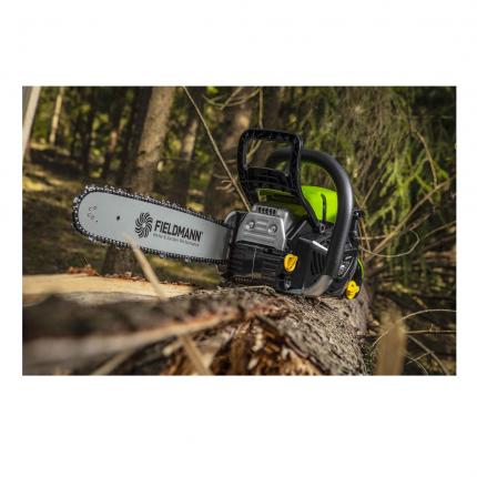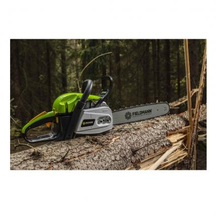 Startování pily se studeným motorem je usnadněno systémem zapalování C.D.I., takže ani v zimě není pro nastartování potřeba velká fyzická síla. Lišta optimální délky 40 cm a hmotnost 6 kg zaručuje uživateli při práci obratnost. Ovladatelnost pily podporuje také protiskluzová úprava rukojeti. Standardem stroje jsou integrované bezpečnostní prvky, jako je bezpečnostní řetězová brzda pro okamžité zastavení řetězu, která chrání před zpětným rázem, a pevná zubová opěrka na konci řetězu. Samozřejmostí je také snadná údržba. Kvalitní řetěz Fieldmann je mazán automatickou olejovou pumpou, což snižuje tření a zvyšuje životnost řetězu, sílu mazání lze pohodlně nastavit pouhým šroubovákem. Kromě nezbytného nářadí pro manipulaci s lištou a řetězem, je součástí balení také kalibrovaná nádoba pro přípravu palivové směsi v odpovídajícím poměru.